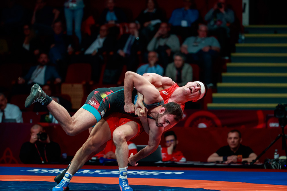 Роман Власов на чемпионате Европы по греко-римской борьбе (Бухарест, Румыния), 12-14.04.2019 (фото Григорий Аванян (Россия) и Костадин Антонов (Kostadin Antonov, Bulgaria))